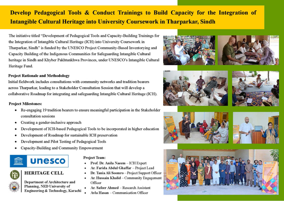 • Prof. Dr. Anila Naeem – ICH Expert • Ar. Farida Abdul Ghaffar – Project Lead • Dr. Tania Ali Soomro – Project Support Officer • Ar. Hussain Khalid – Community Engagement Officer • Ar. Safeer Ahmed – Research Assistant • Ayla Hasan – Communication Officer • Anila Rahim – Data Manager Project Rationale and Methodology The current phase focuses on the development of pedagogical resources to facilitate the incorporation of ICH into higher education curricula and on conducting capacity-building trainings for relevant stakeholders. Initial fieldwork involves individual and group consultation meetings with pre-established community networks and tradition bearers in Mithi, Pabohar Village, Tabbho Meghwar, Islamkot, Nagar Parkar, and surrounding areas. These consultations precede a Stakeholder Consultation Session, designed to consolidate insights and foster participatory planning. Notably, most of the tradition bearers associated with the previously documented 19 ICH elements have been re-engaged to ensure their sustained and meaningful participation. |