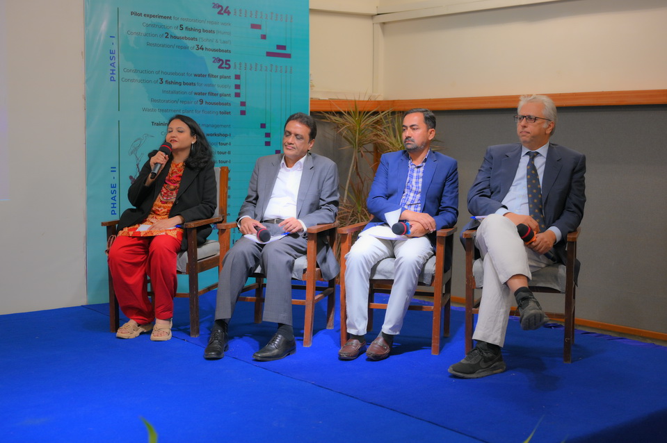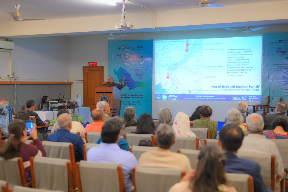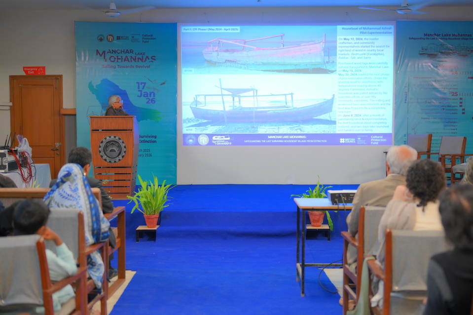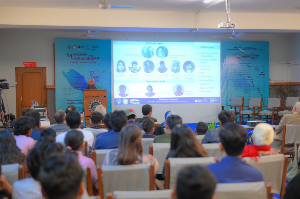 The program offered a comprehensive overview of the project’s journey, tracing its development from the Endangered Wooden Architecture Program (EWAP) in the year 2023 to the broader initiative of Safeguarding the last surviving houseboat village from extinction in the year 2024 and 2025. Through documentary screenings and presentation by Prof. Dr. Anila Naeem, Project PI and Chairperson Department of Architecture and Planning, NED University, the event highlighted the social, environmental, and cultural challenges faced by the Mohanna community while foregrounding their resilience, identity, and heritage.