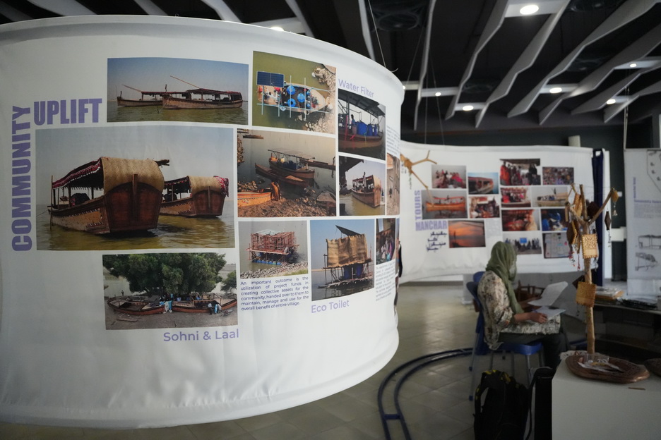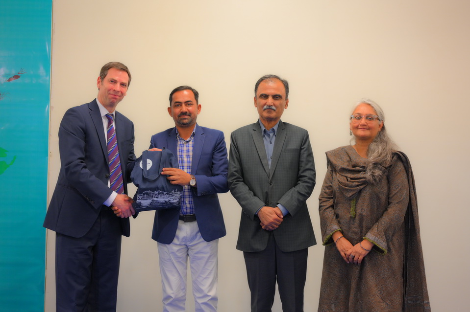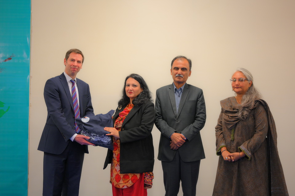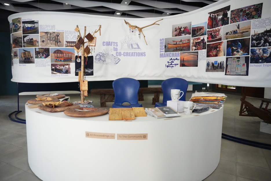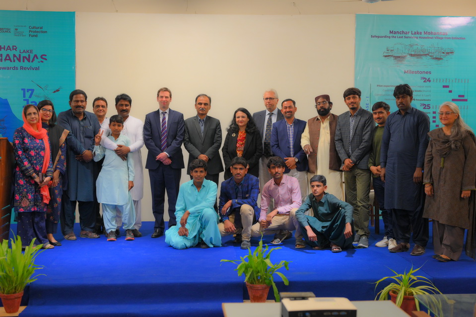 The evening was further distinguished by the keynote address of Mr. Lance Dom, Deputy High Commissioner – British Council, who highlighted the importance of cultural preservation, local participation, and international collaboration in addressing the challenges faced by marginalized communities. The event also acknowledged the invaluable role of those involved in the project through the presentation of souvenirs to community members, team members, and panelists.key highlight of the closing event was tA key highlight of the closing event was the opening of two exhibitions: Manchar Lake Mohannas: Sailing Towards Survival, showcasing the project’s outcomes and merchandise, curated by Heritage Cell team members Ayla Hasan and Safeer Ahmed; and Manchar Lake Mohannas Art Residency, featuring artworks produced during the residency, curated by Sohail Zuberi.