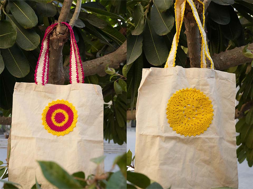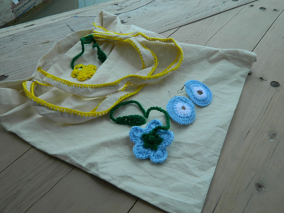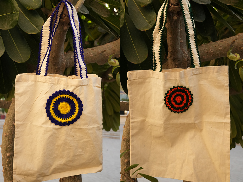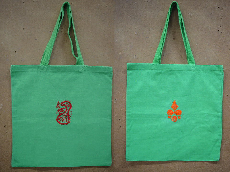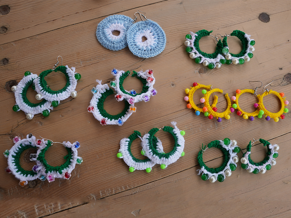 embroidered tote bags, cushion covers, and crochet earrings inspired by