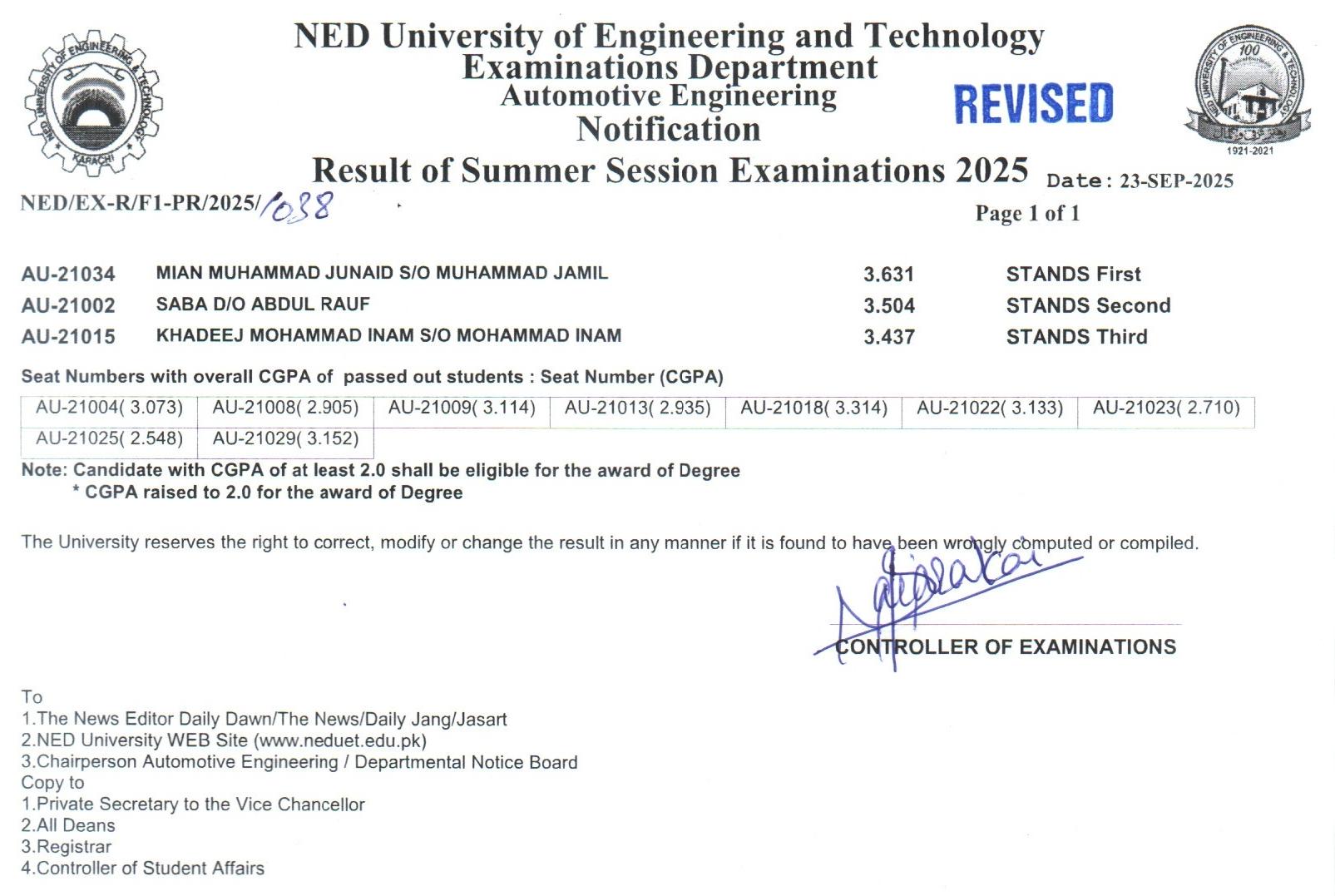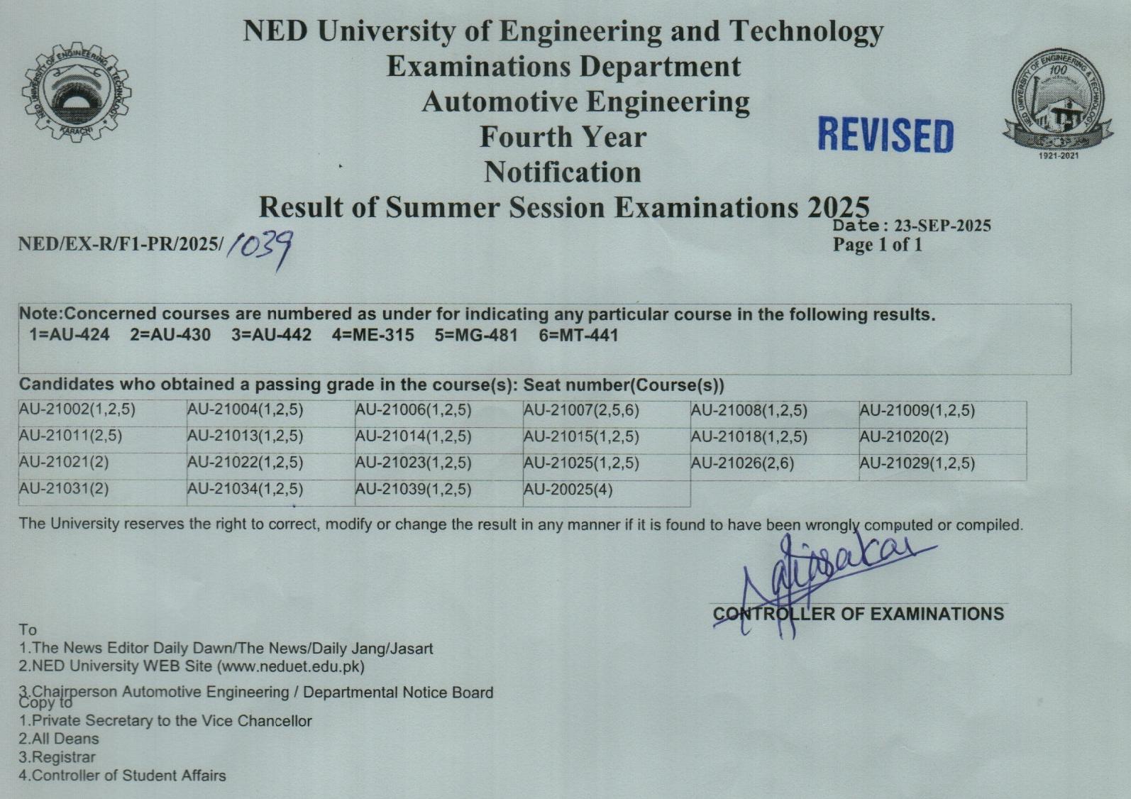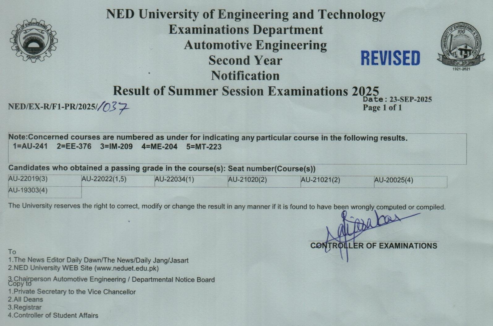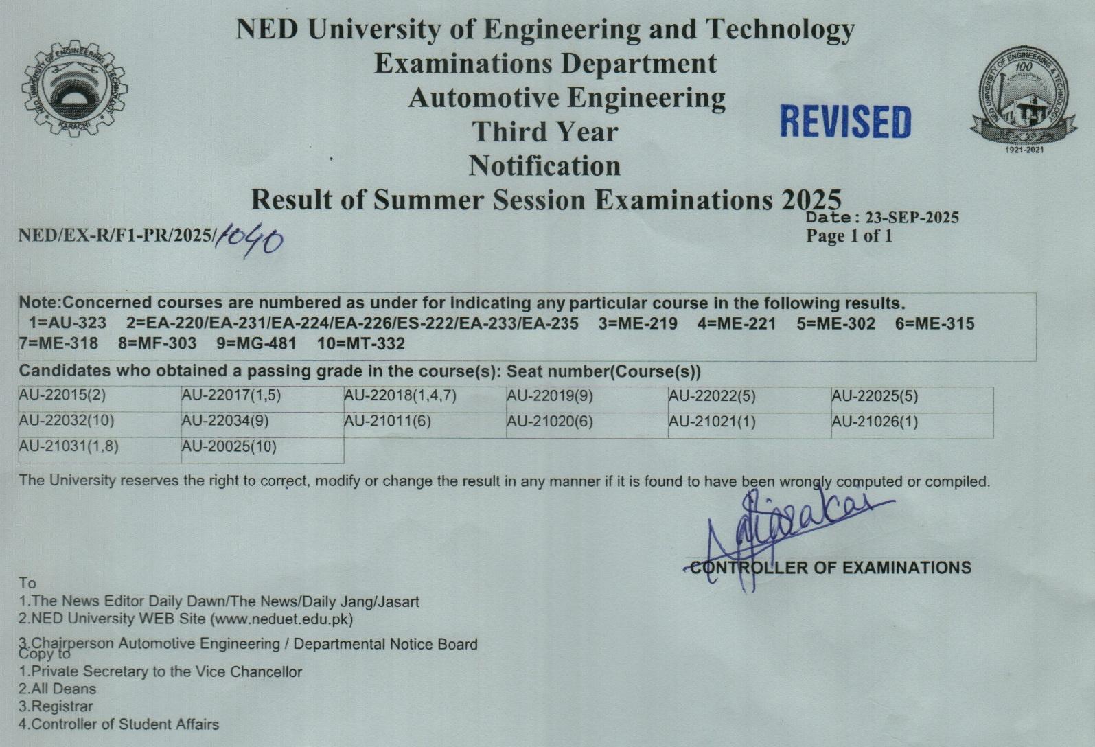 UIT – USMAN INSTITUTE OF TECHNOLOGY RESULTS (SUMMER SESSION EXAMINATIONS - 2025) |