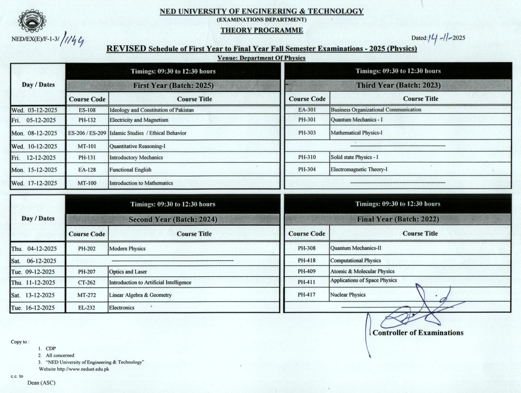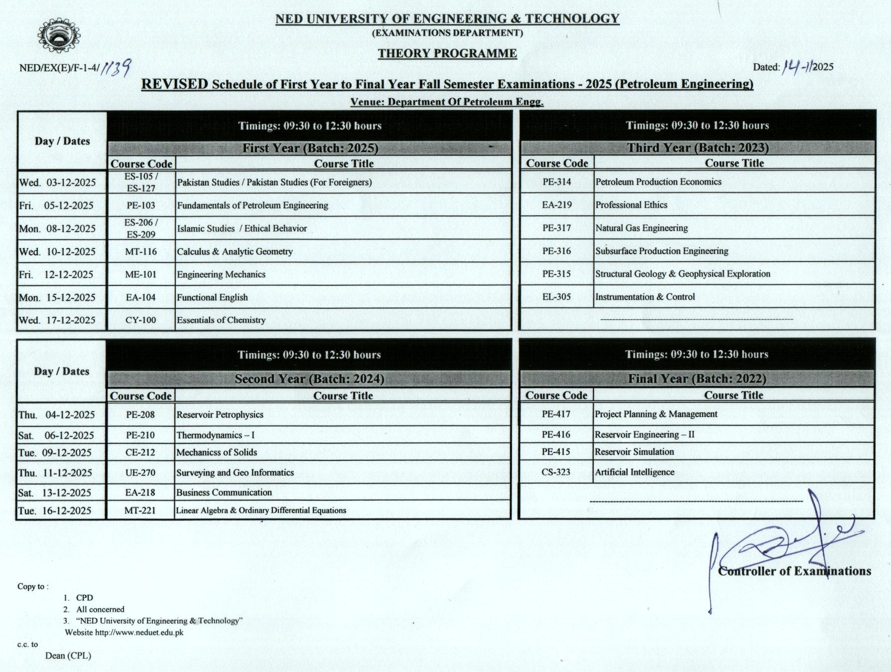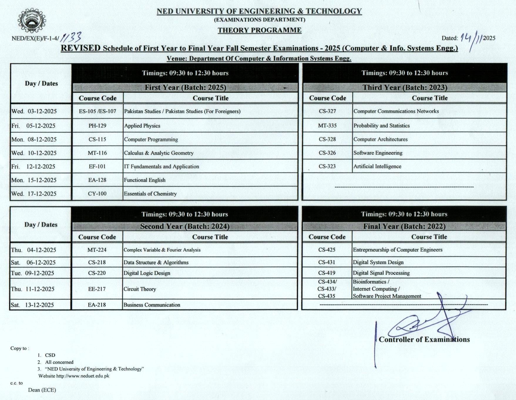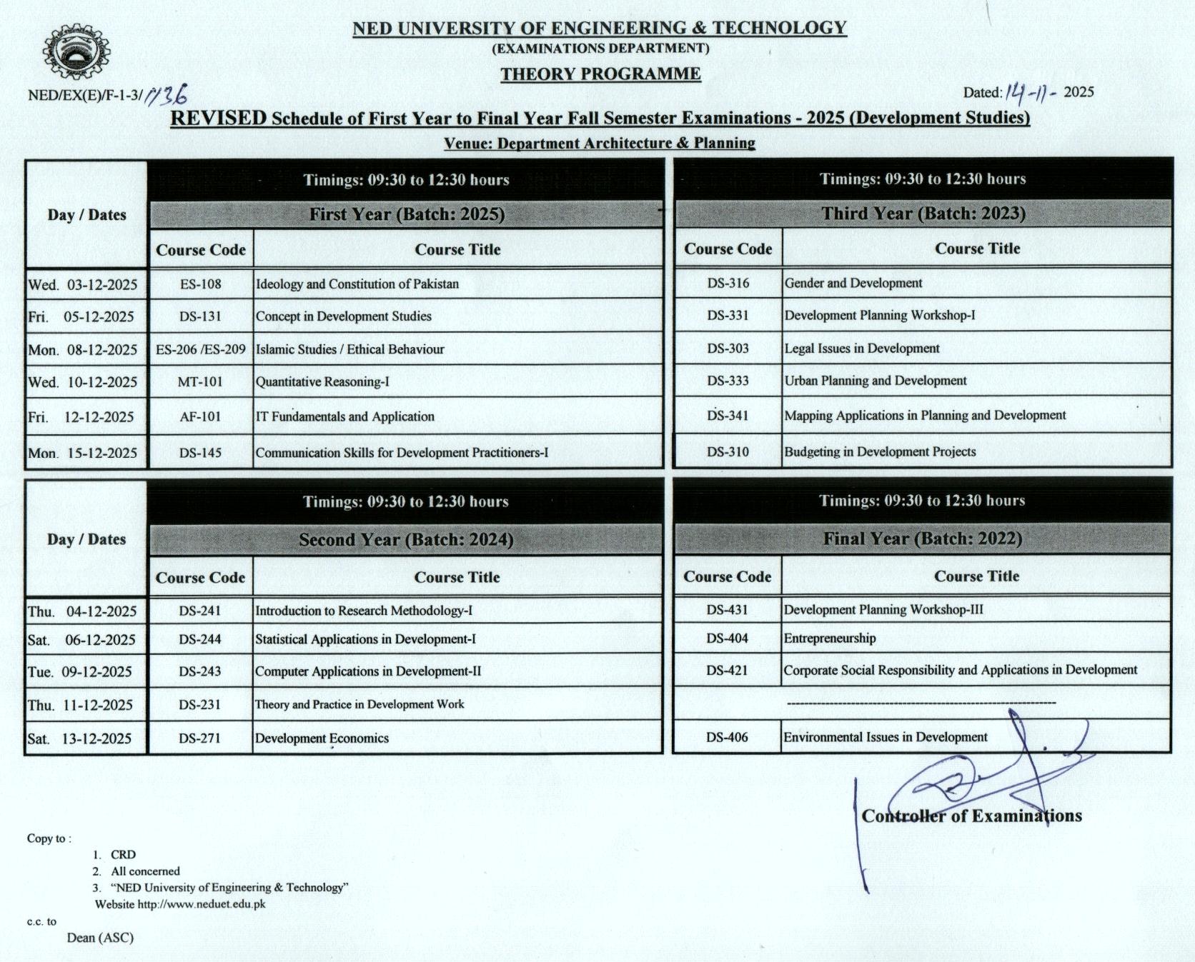 - Undergraduate - Revised Schedule of Clash Courses of Fall Semester Examinations - 2024