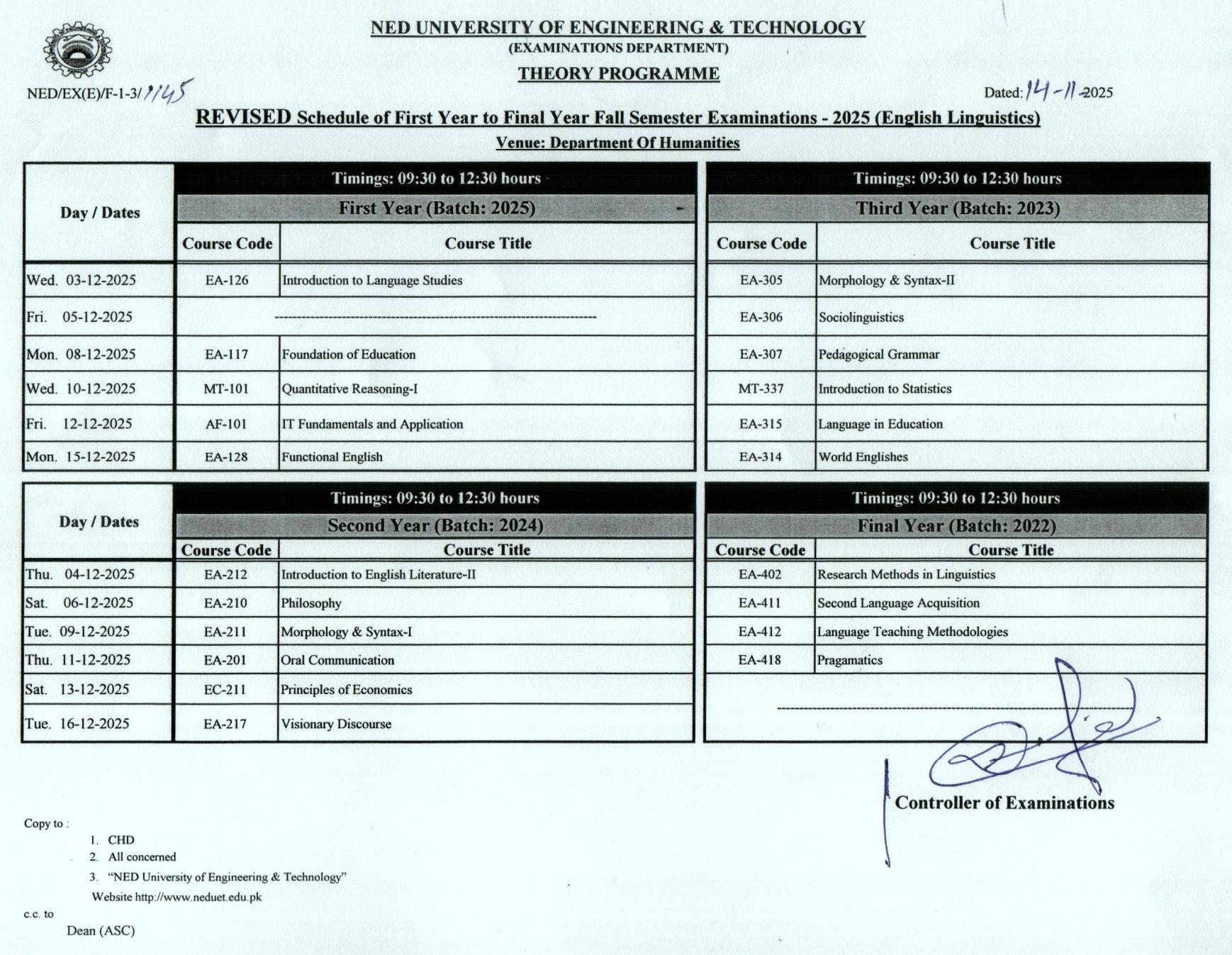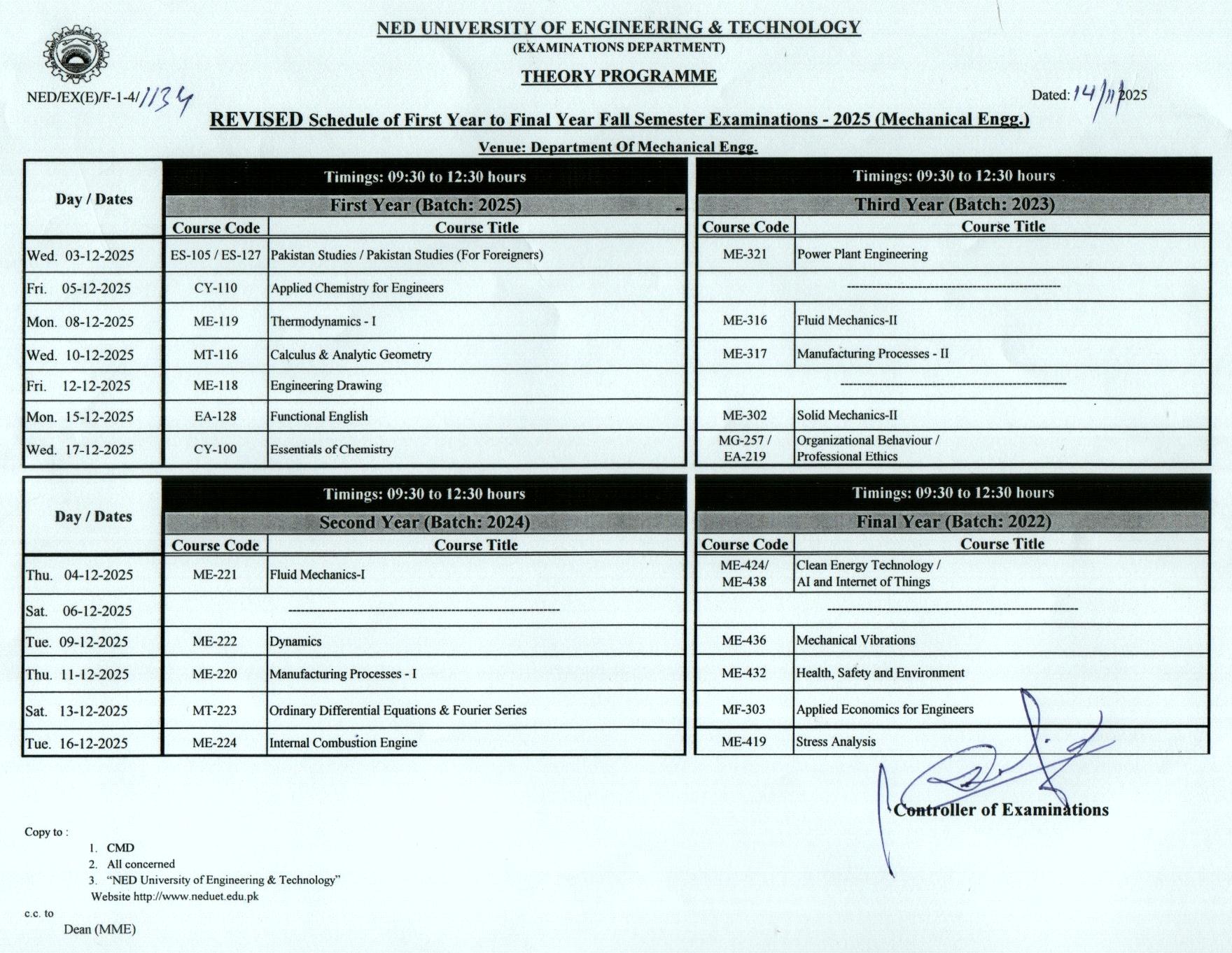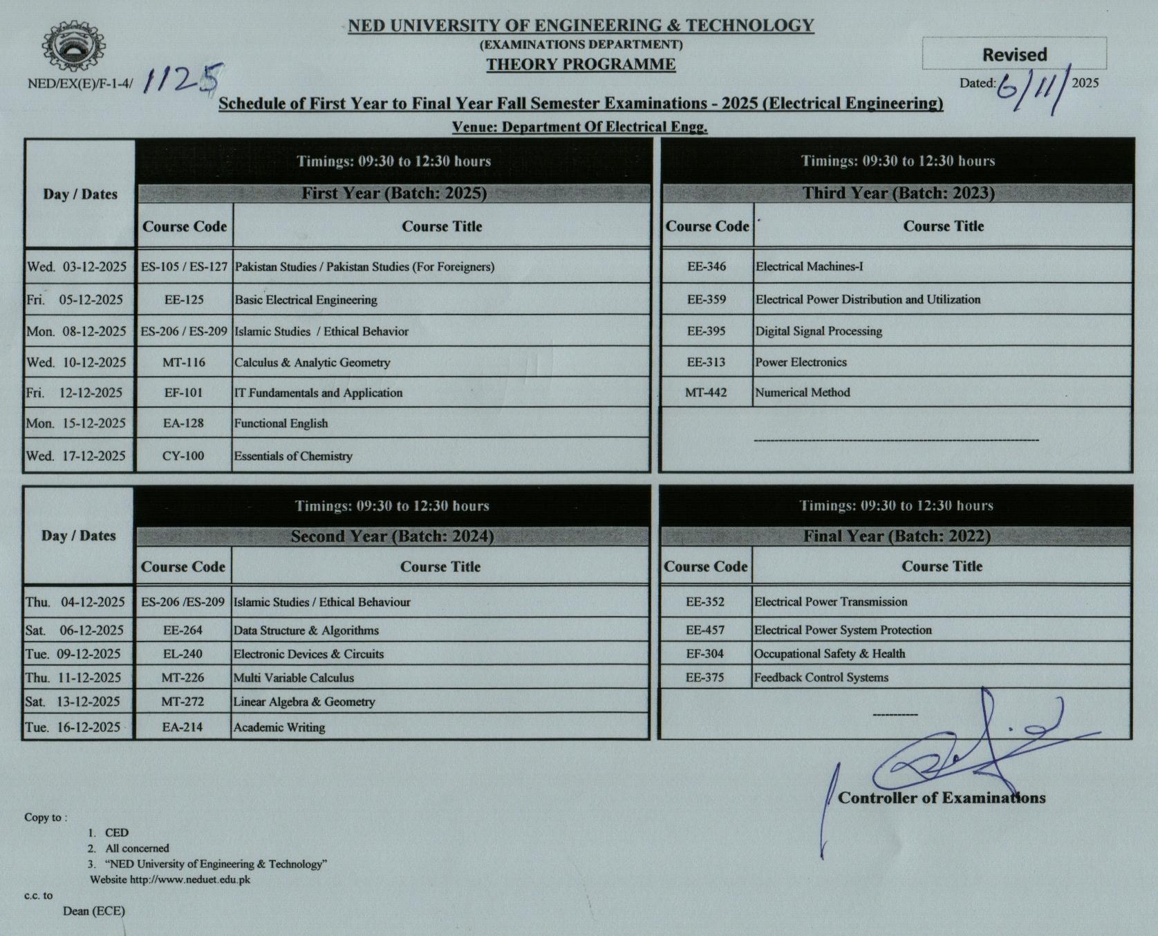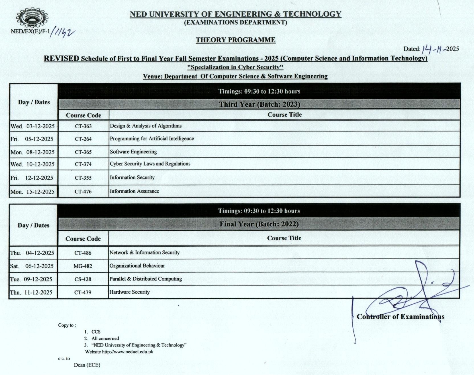 - Undergraduate - Revised Schedule of Clash Courses of Fall Semester Examinations - 2024