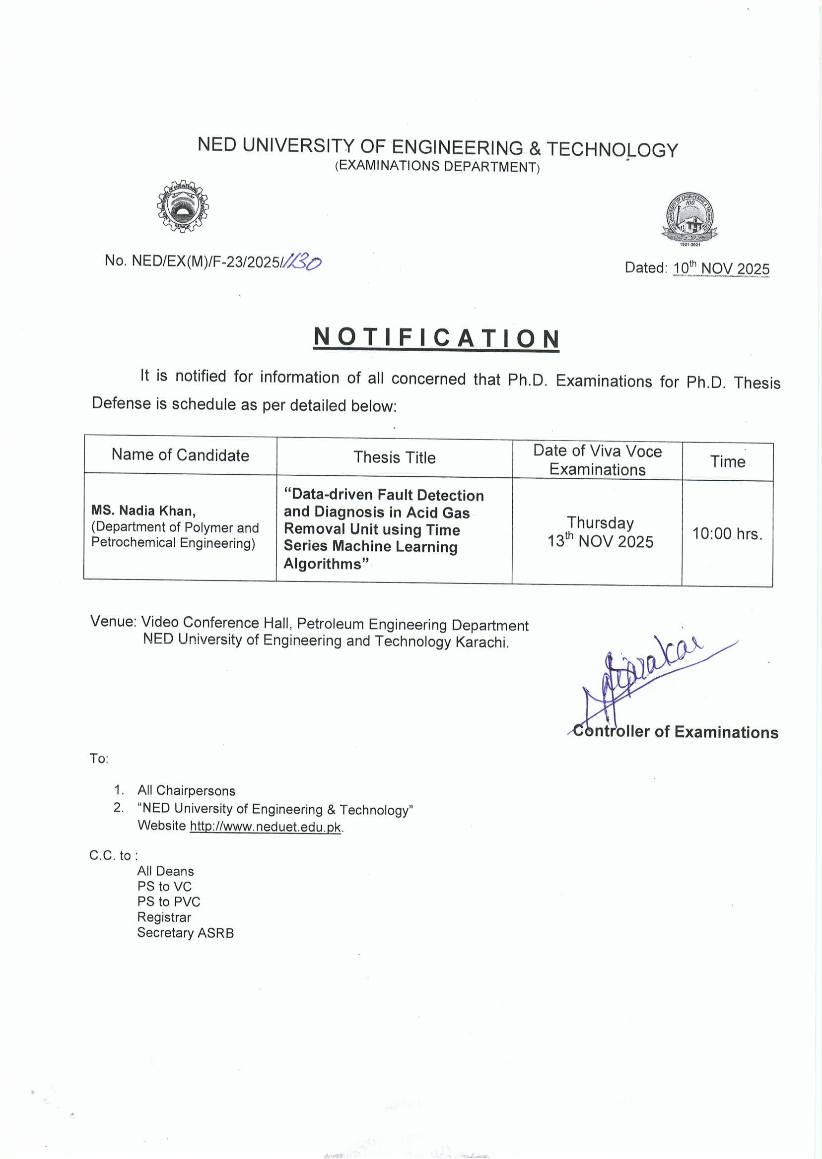 - Ph.D. - Viva Voce Examinations for Thesis Defense (Ms. Nadia Khan)