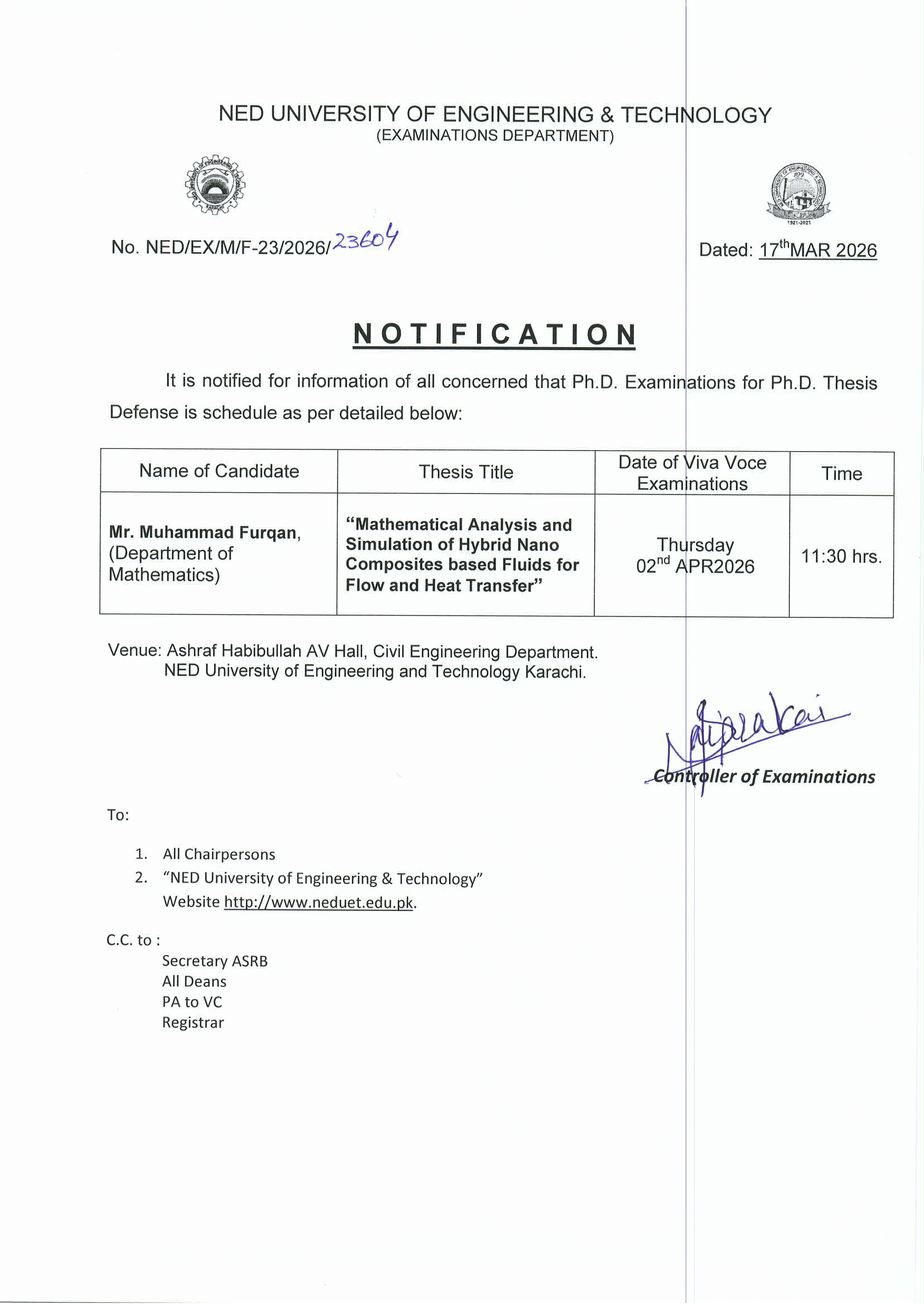 - Ph.D. - Viva Voce Examinations for Thesis Defense (Mr. Muhammad Furqan)