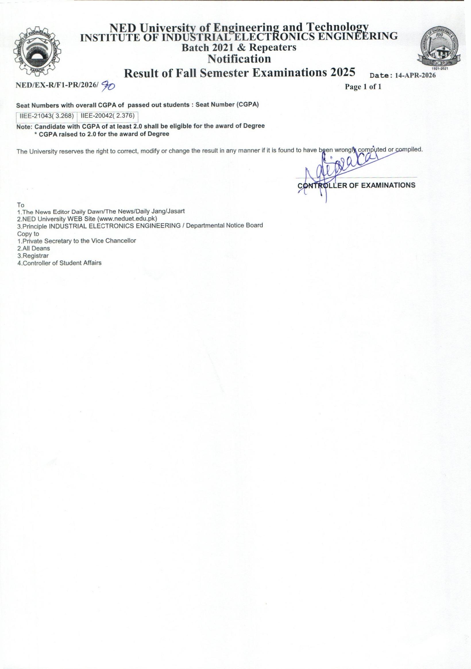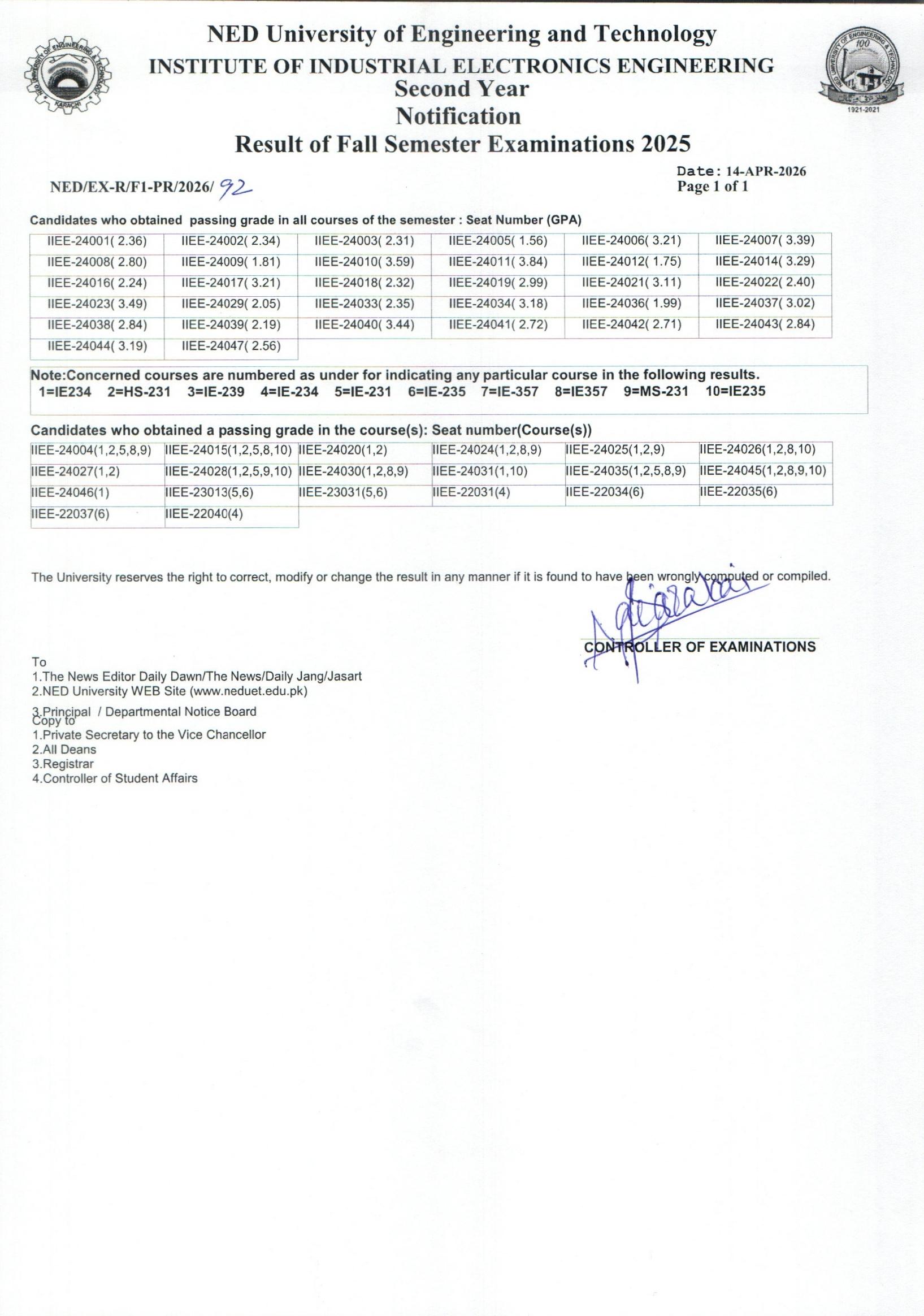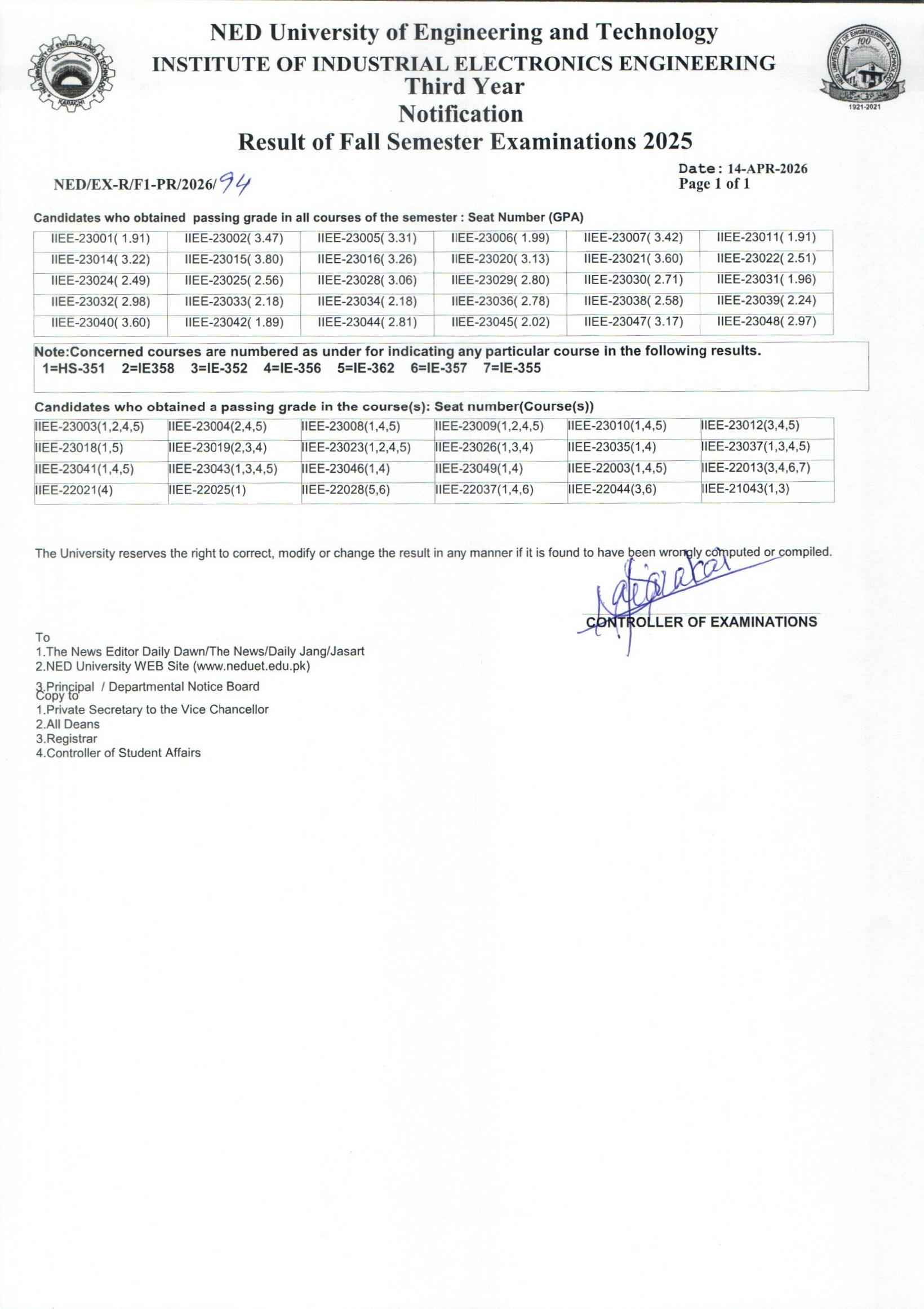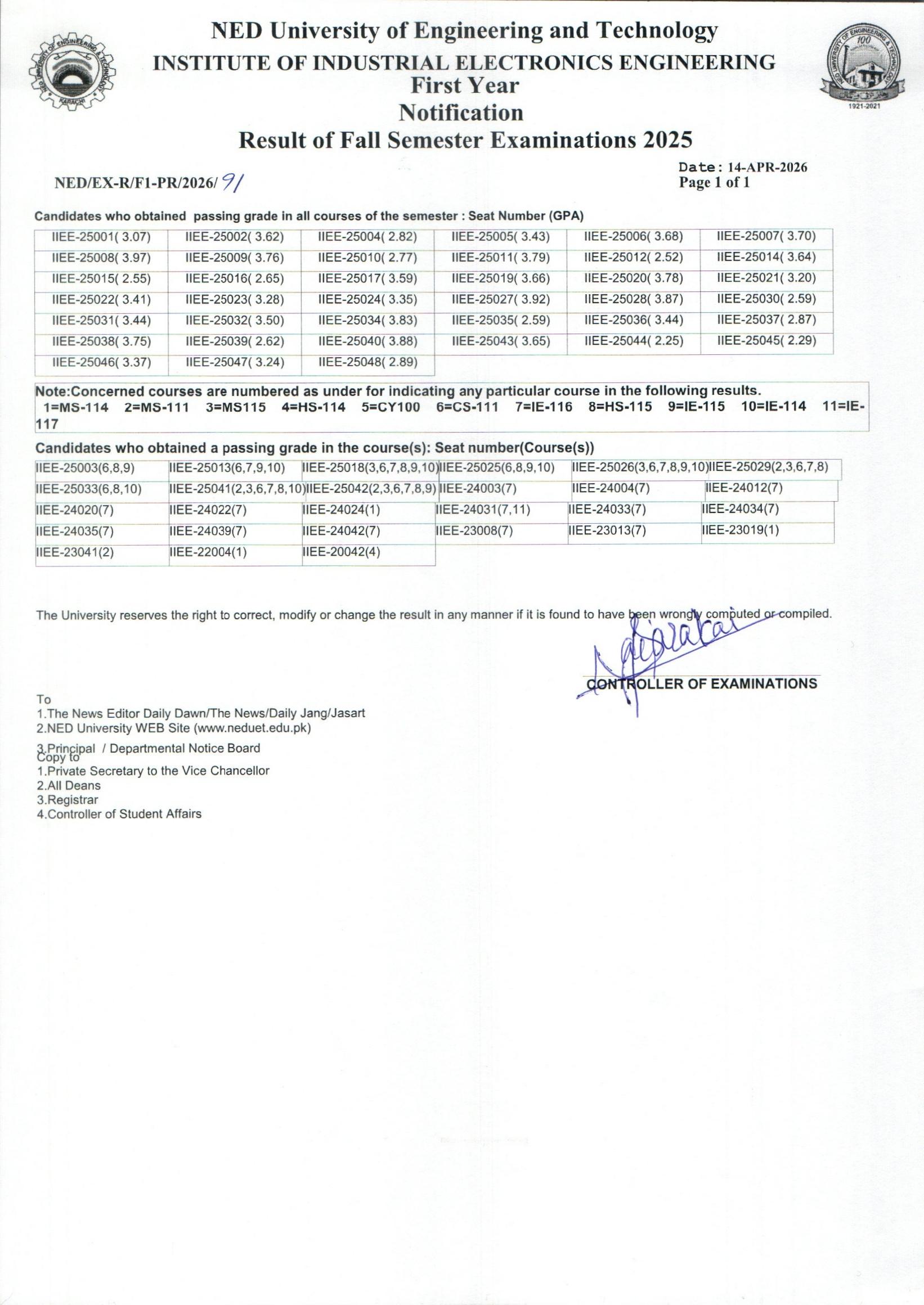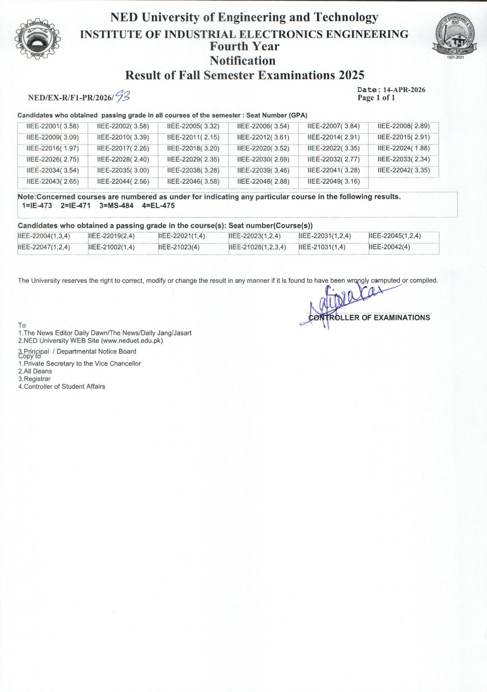 | IIEE – INSTITUTE OF INDUSTRIAL ELECTRONICS ENGINEERING RESULTS (FALL SEMESTER EXAMINATIONS 2025 ) |