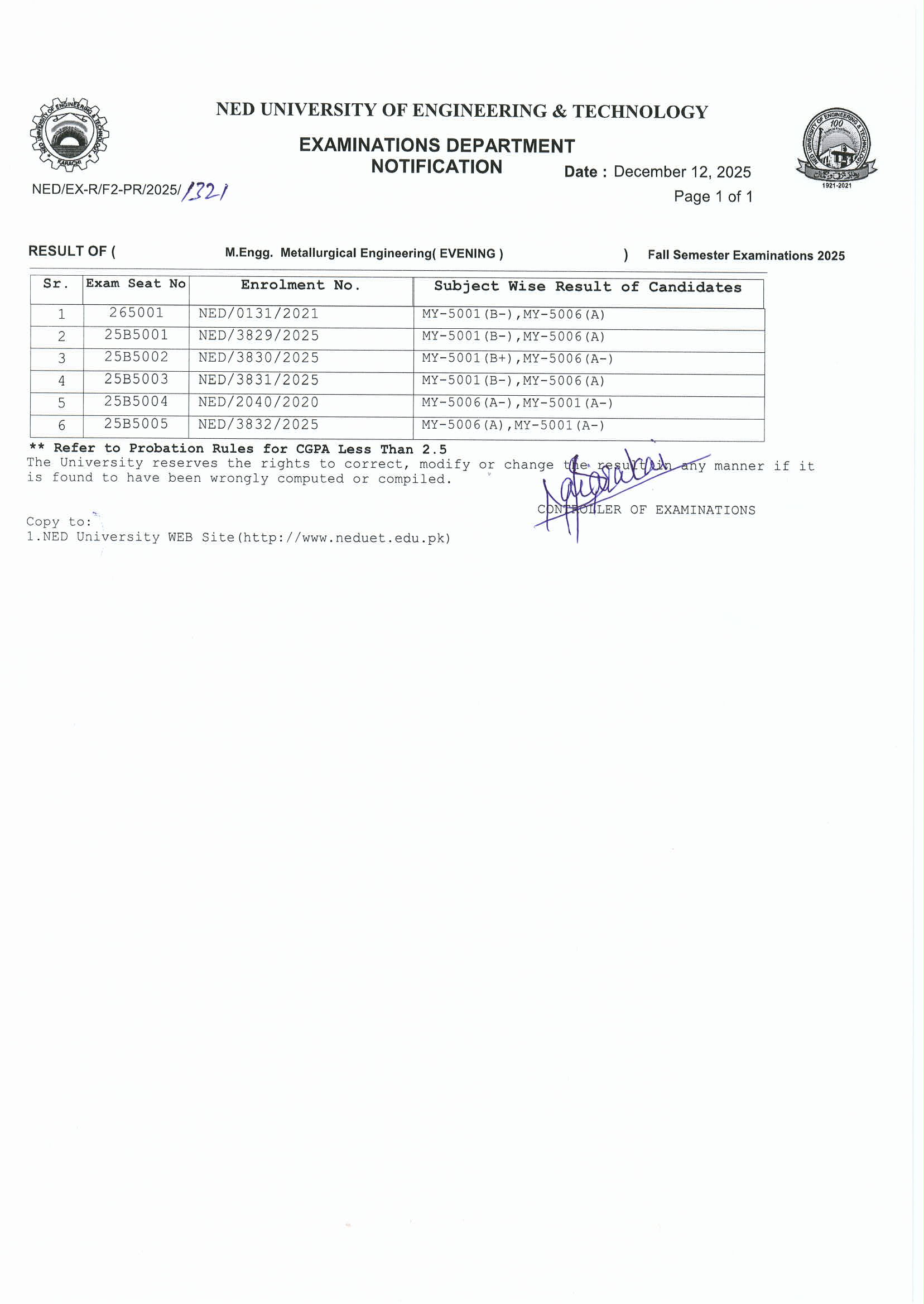 | PMA – PAKISTAN MARINE ACADEMY RESULTS (SPRING SEMESTER EXAMINATIONS 2025) |