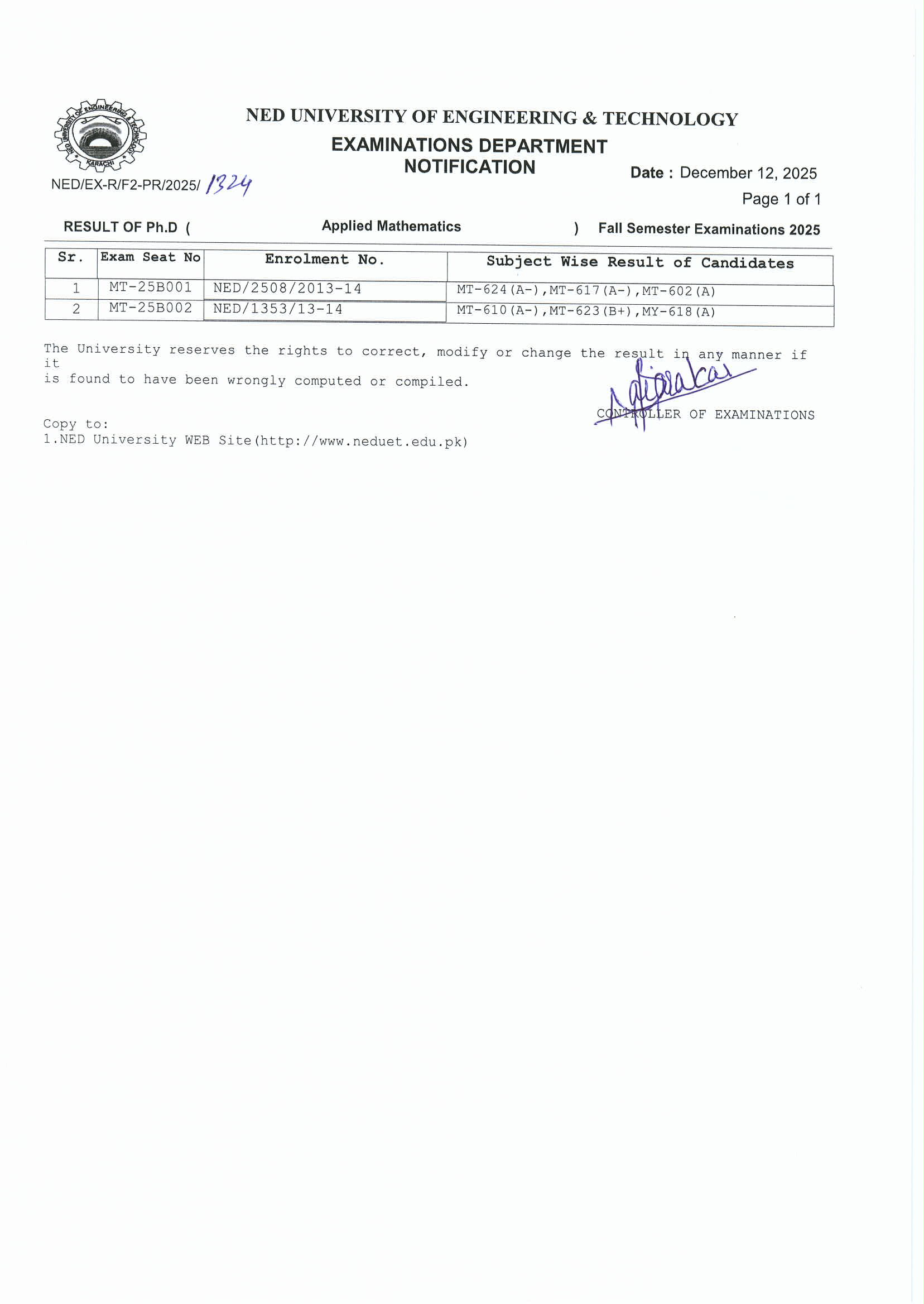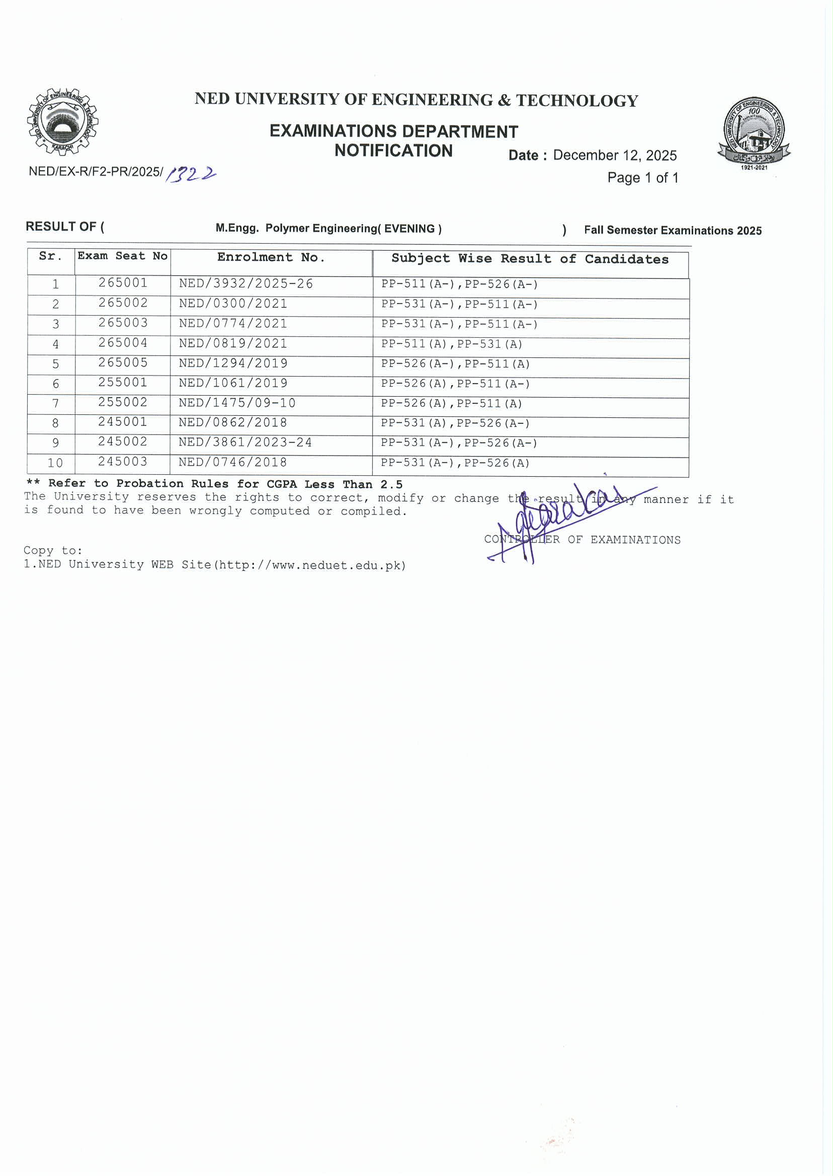 | POSTGRADUATE RESULTS (FALL SEMESTER 2025) |
