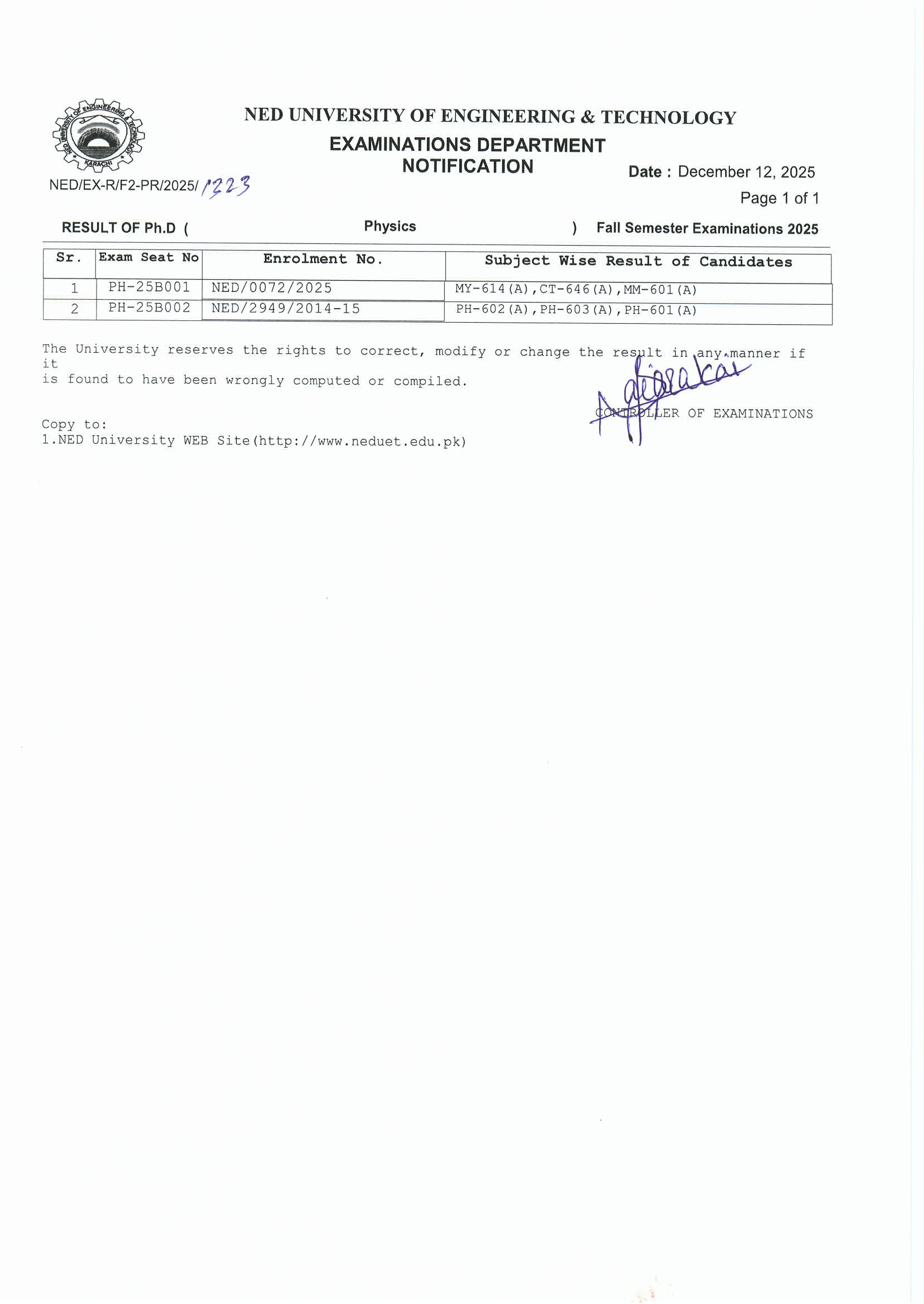 | Ph.D. – DOCTOR OF PHILOSOPHY RESULTS (FALL SEMESTER 2025) |