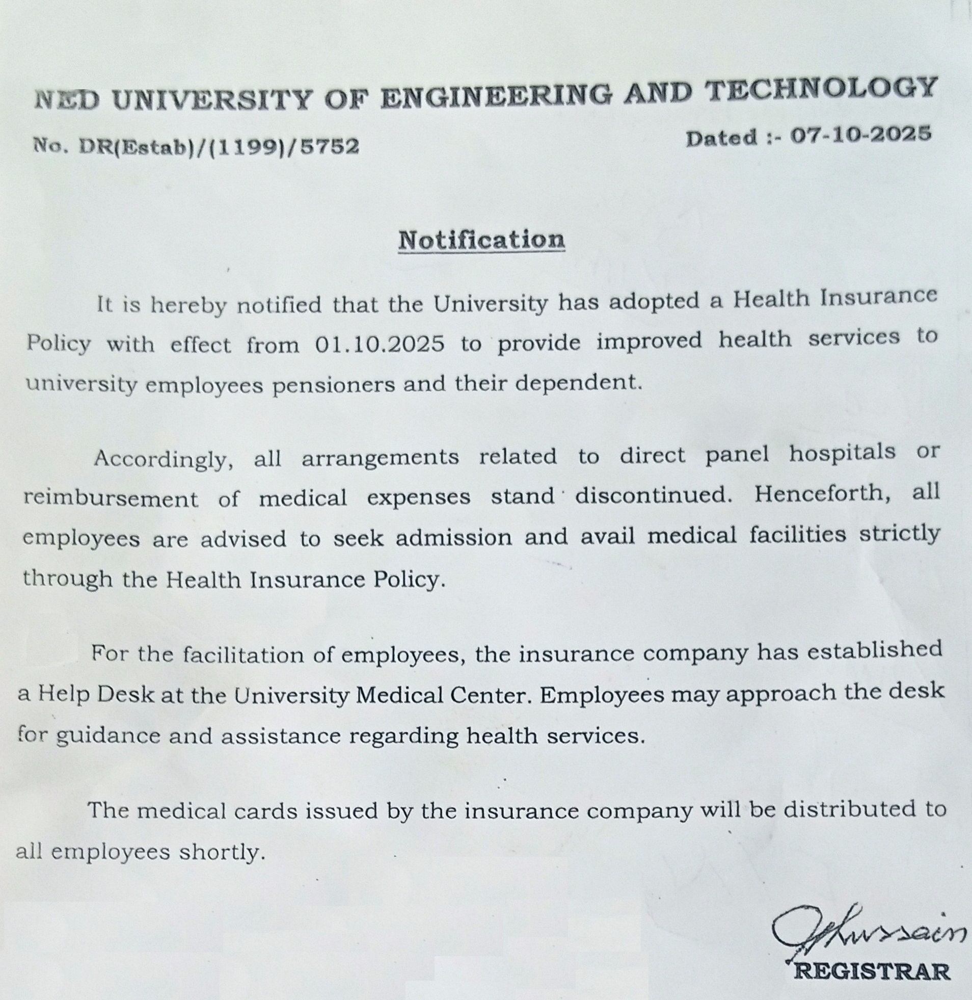 Distinguishes itself from others by its structure, the nature of work undertaken and the importance of its activities. It consists of the main medical Department (NED Main Campus), Medical Sub Centre LEJ Campus and City Campus which deals with students / Employees of the University.